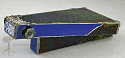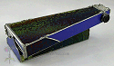 Truncated triangular body, off axis. Small vial with screw cap as object cell (can open) inserted into scope. Very thin lampworked pieces, small gears, fine grains. Matching base.