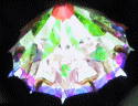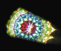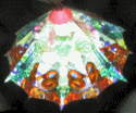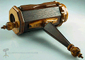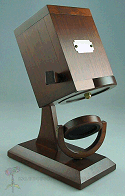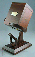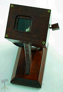 Special features: This scope is numbered 12303. Exterior of cherry wood, with brass hardware. A spring loaded lever opens and closes the interior image of a parasol. The designs on the panels of the parasol change as you turn the object cell. This is the eighth in a series of polyangular scopes by Wiley.