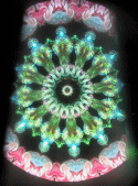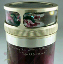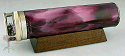 Special features: Large dark and light raspberry slumped glass tube. Side-lit oil filled object cell. Exquisite color coordinated handblown glass objects.